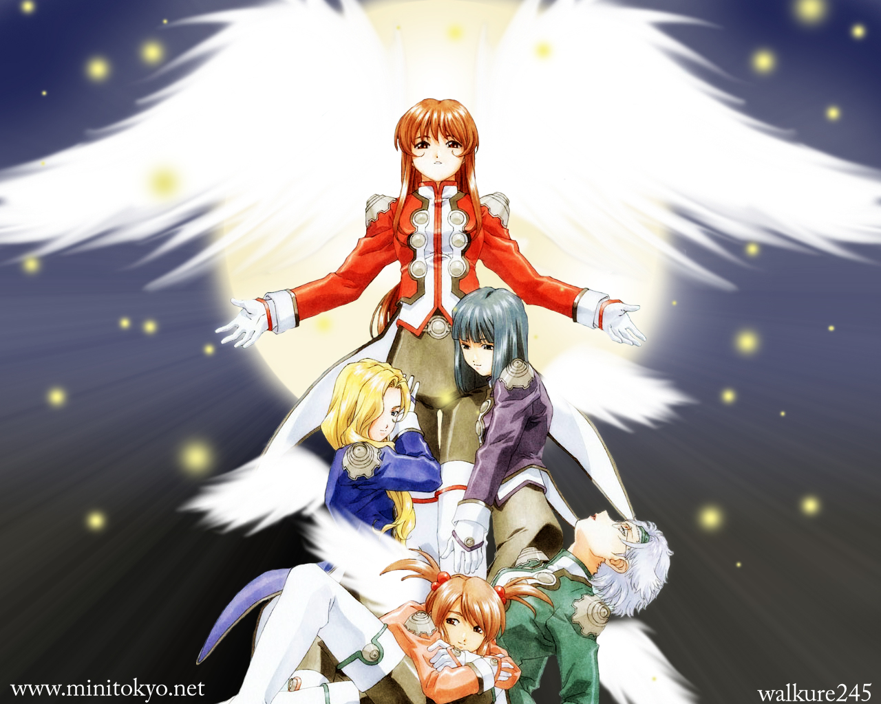 Description: A group of anime characters sitting on top of each other with wings flying above them and a full moon in the background.
