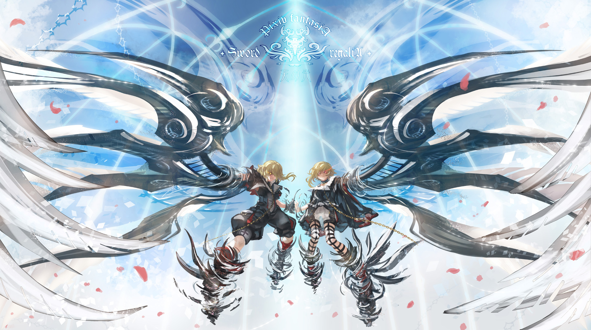 Description: Two anime characters standing next to each other with wings on their backs and wings on their backs.