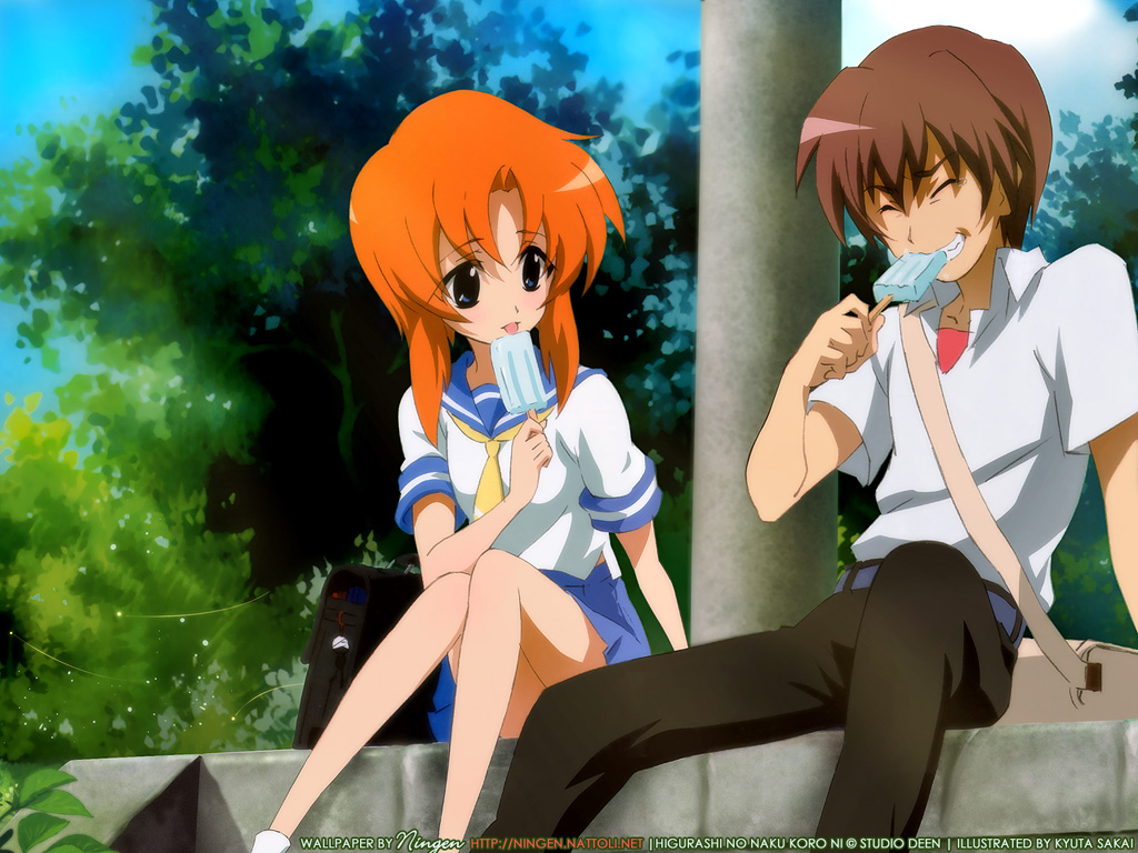Description: Two anime characters sitting on a ledge in the woods.
