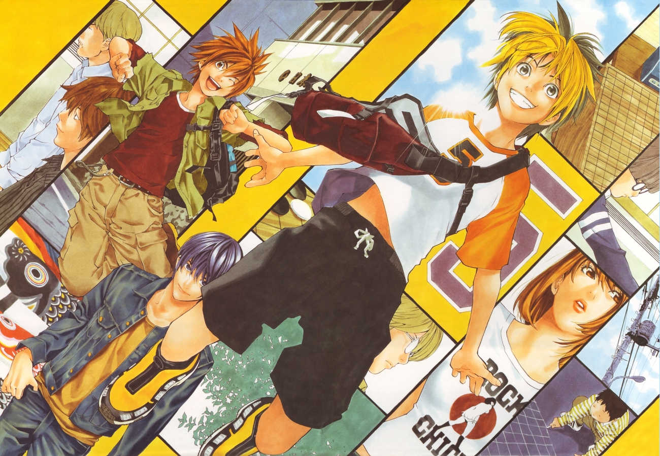 Description: A group of anime characters standing in front of a yellow background with squares of images of them and the words.