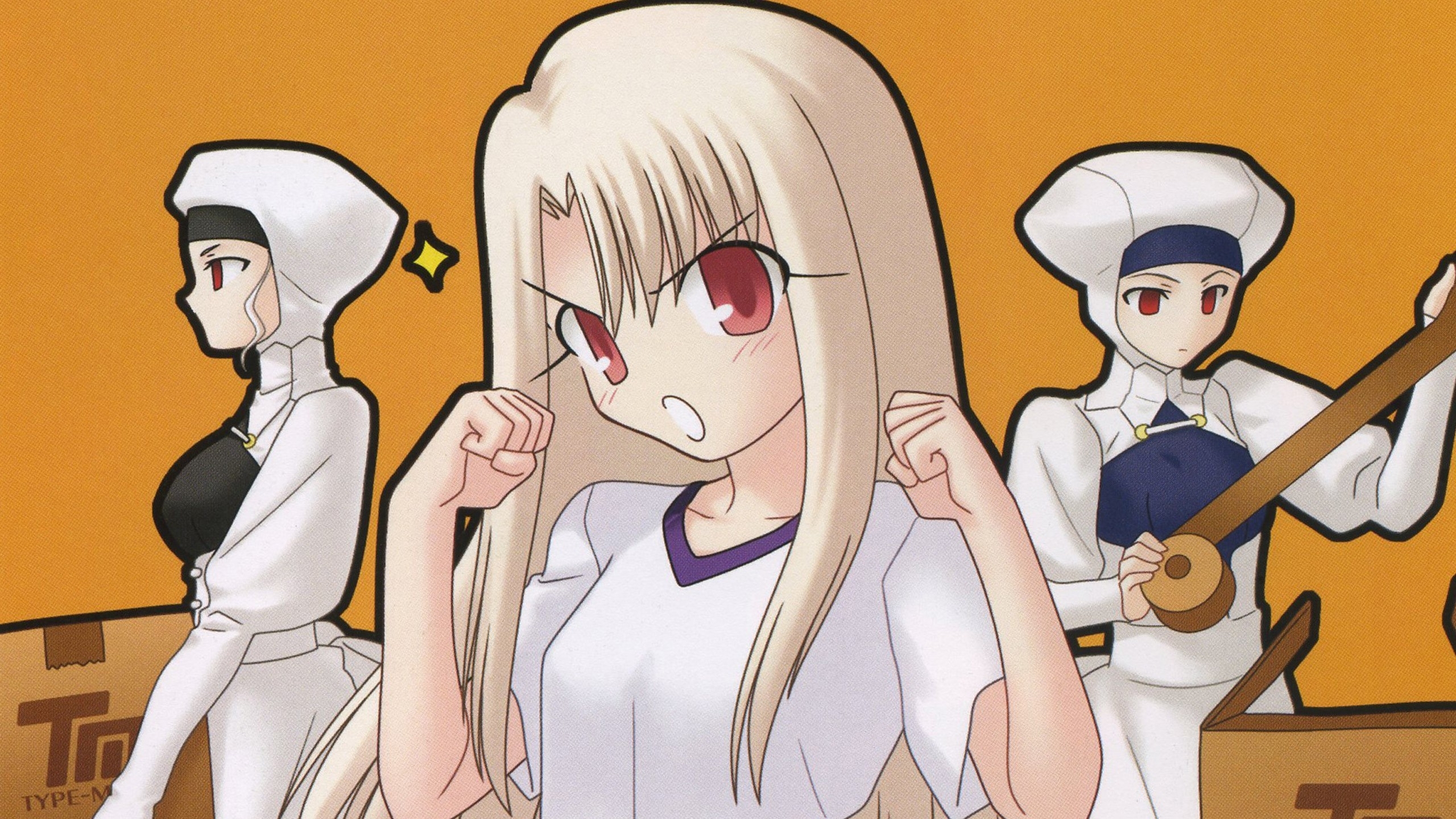Description: A group of anime characters standing around each other in a room with a yellow wall and a yellow background.