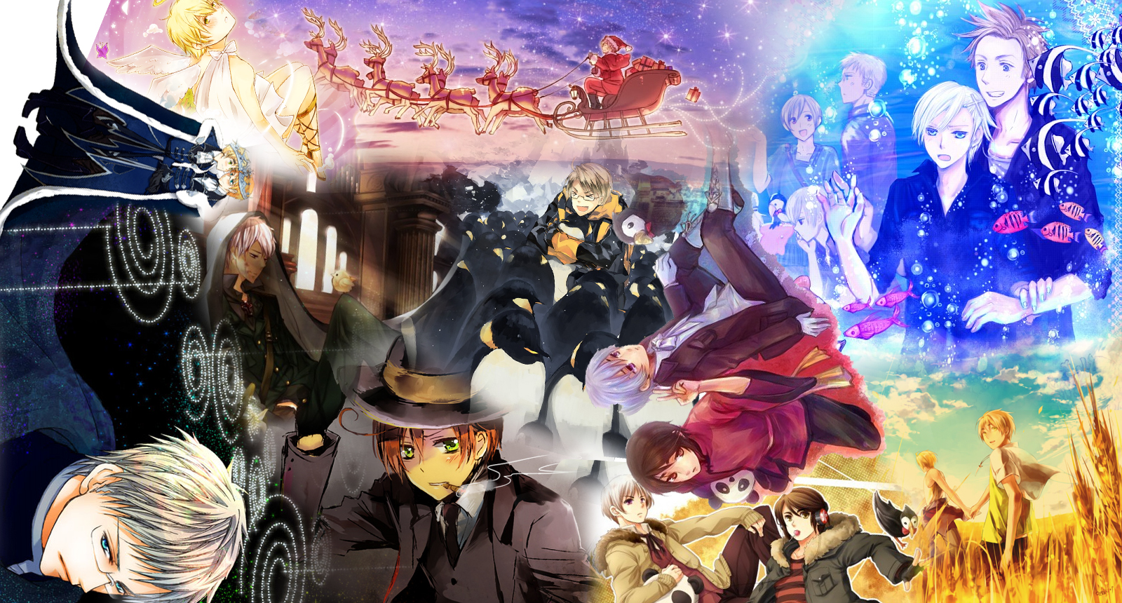 Description: A collage of anime characters with a background of a christmas scene and a man in a top hat.