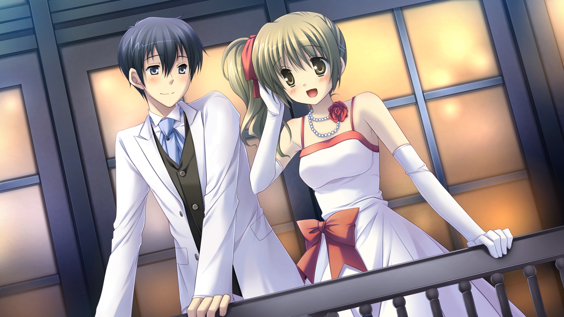 Description: A couple of anime characters standing on a balcony together.