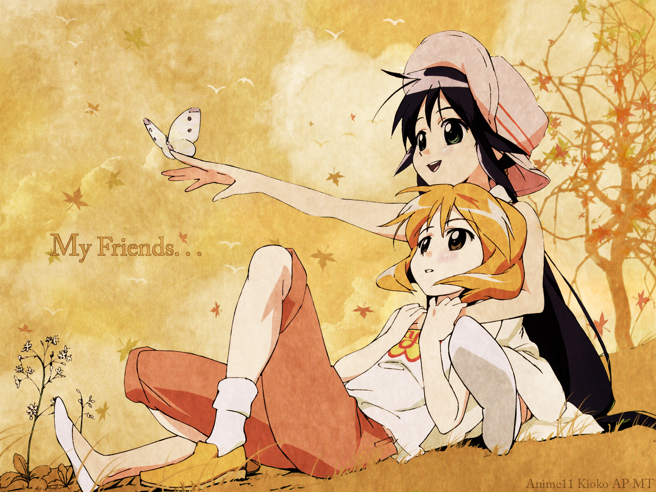 Description: A couple of anime characters sitting on the ground with a bird flying above them and a tree in the background.