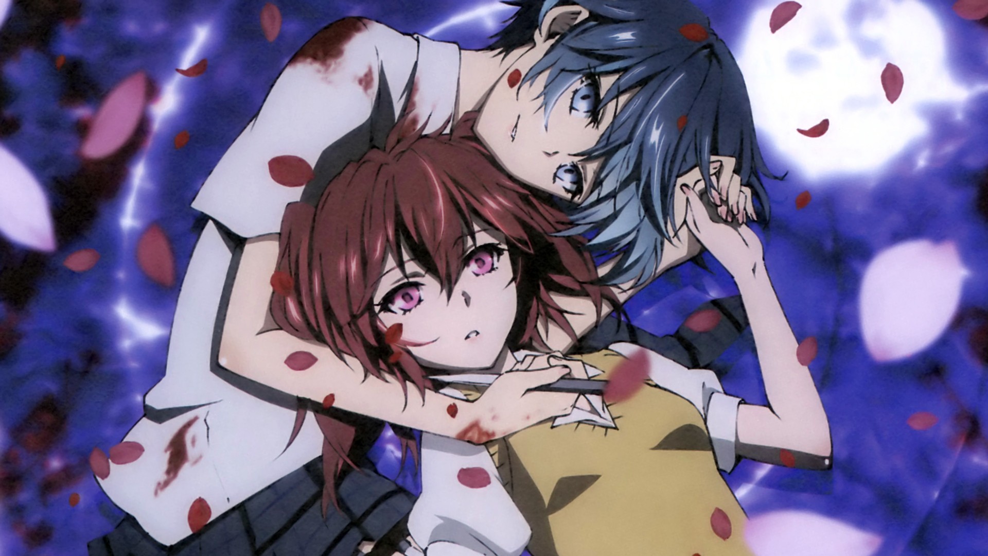 Description: A couple of anime characters hugging each other in front of a purple background with red and white circles of blood.