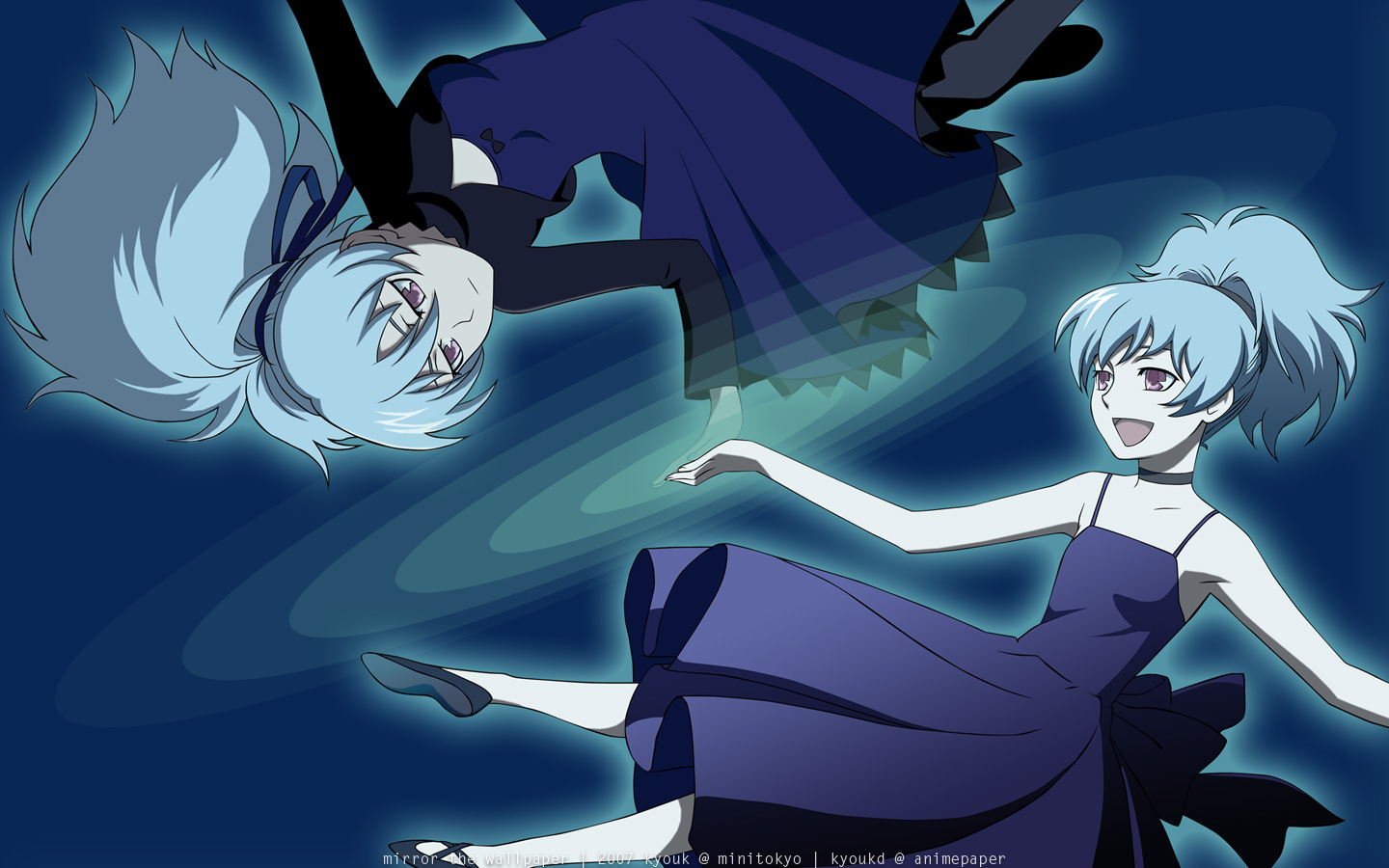Description: A couple of anime characters in blue dresses and black shoes.