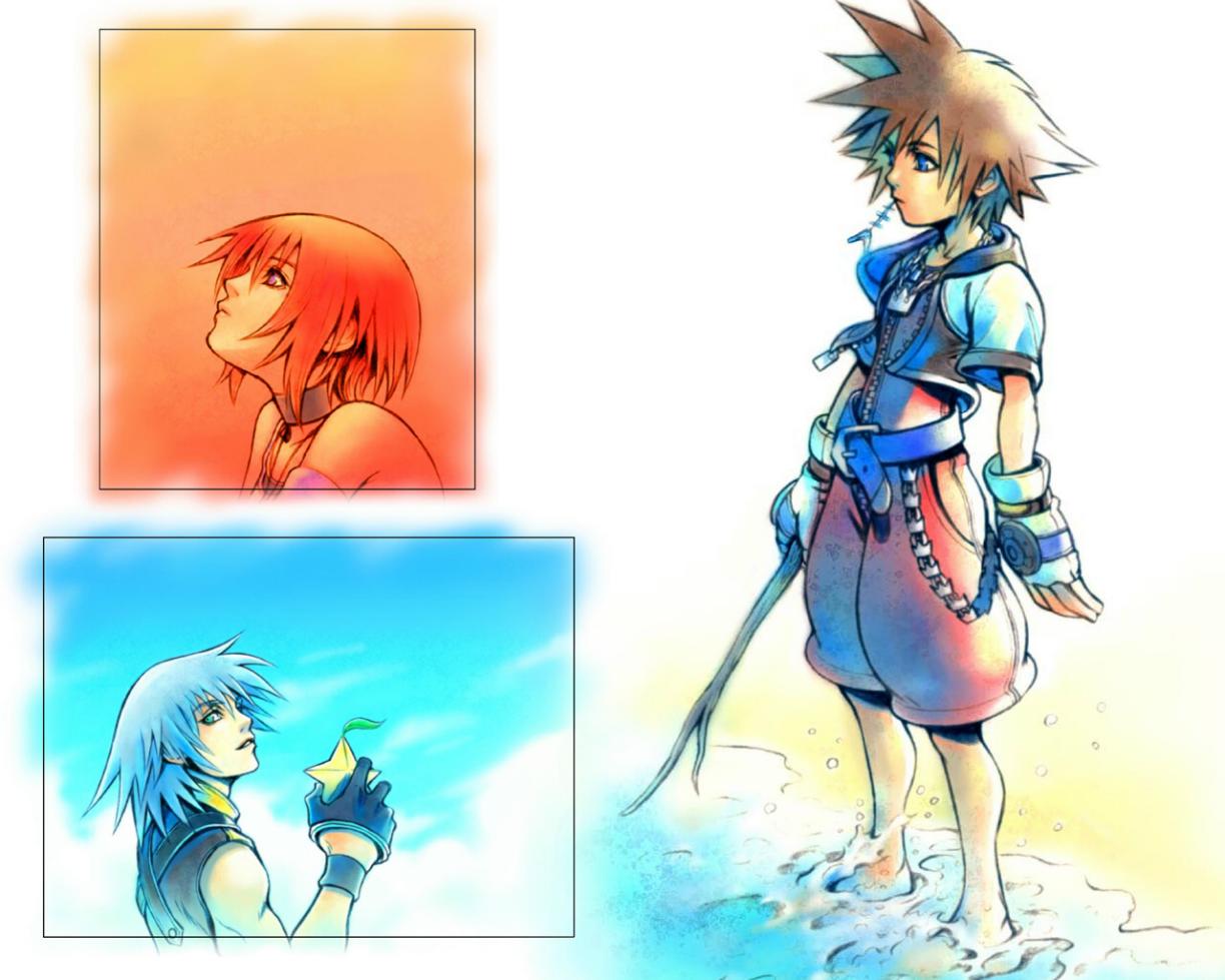 Description: A couple of anime characters standing next to each other in front of a white background with blue and orange colors.