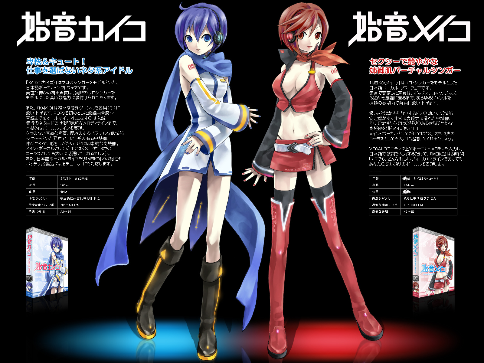 Description: A couple of anime characters standing next to each other on a black background with japanese characters in the background.