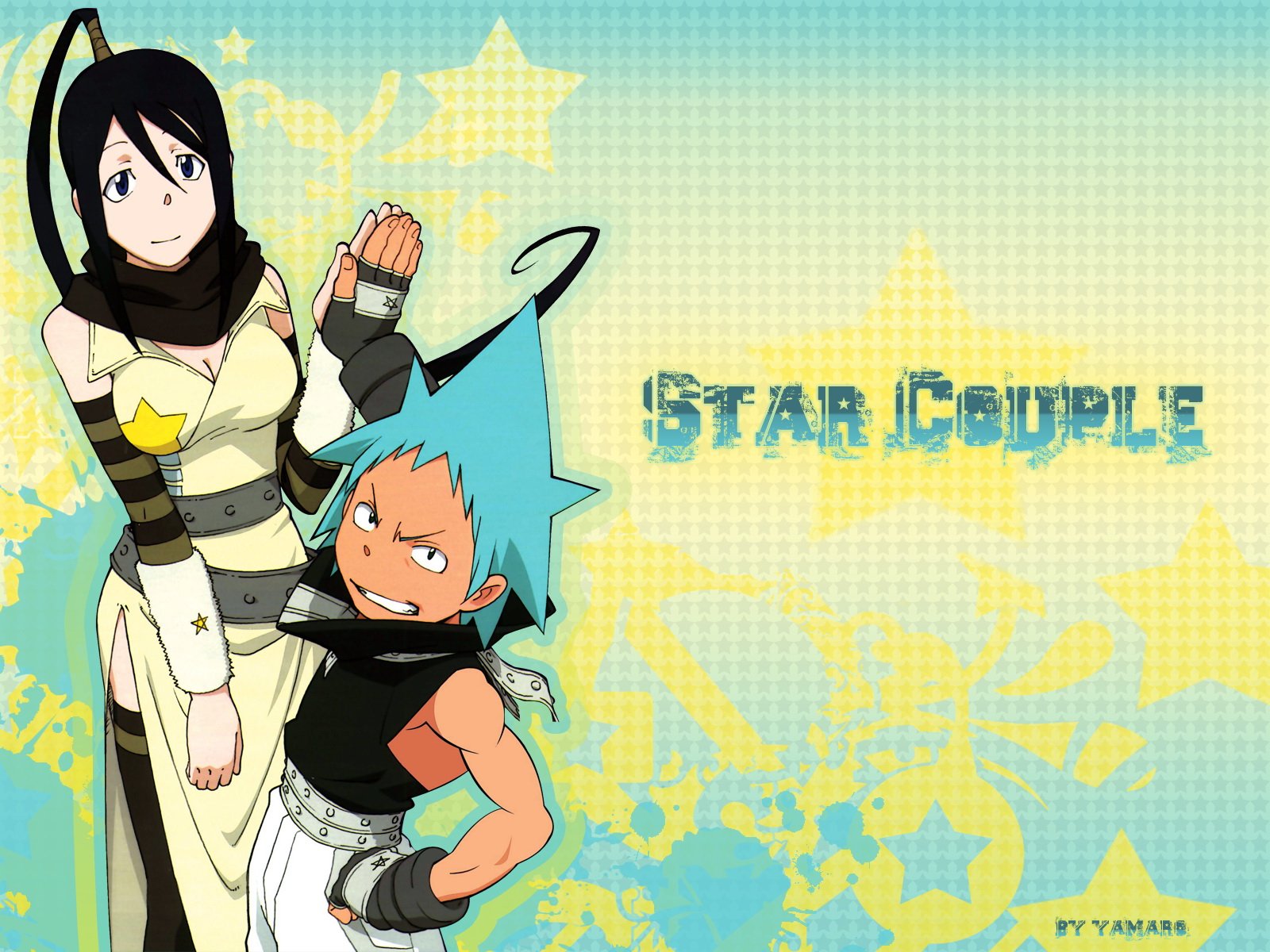 Description: A couple of anime characters standing next to each other on a blue and yellow background with stars in the background.