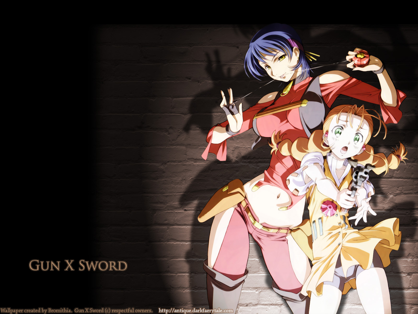 Description: A couple of anime characters standing next to each other on a brick wall with a shadow of a woman.
