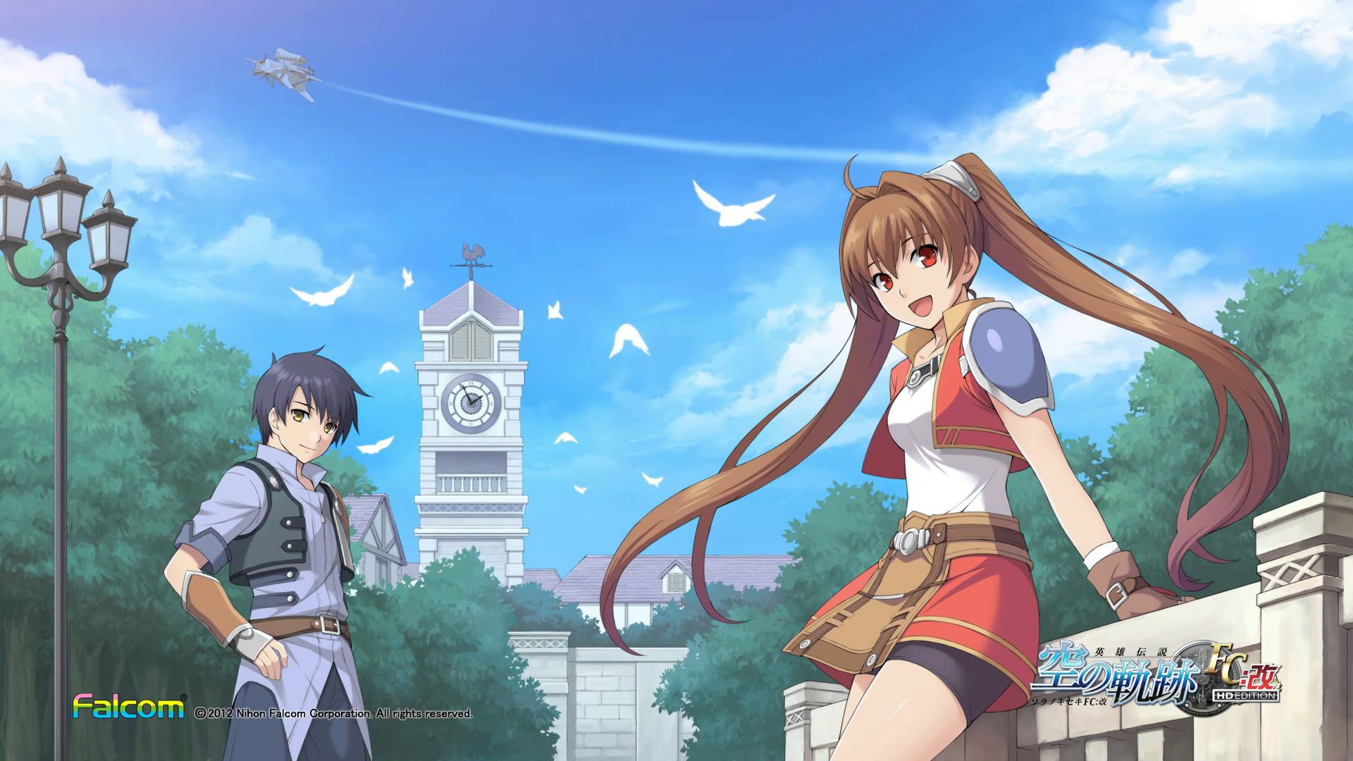 Description: A couple of anime characters standing next to each other in front of a clock tower and a clock tower.