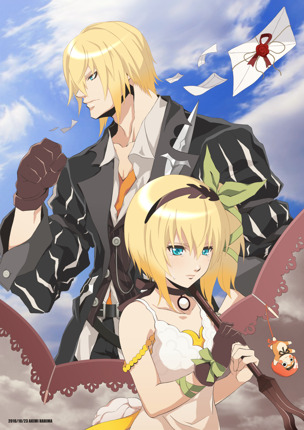 Description: A couple of anime characters standing next to each other on a cloudy day with a kite in the sky.