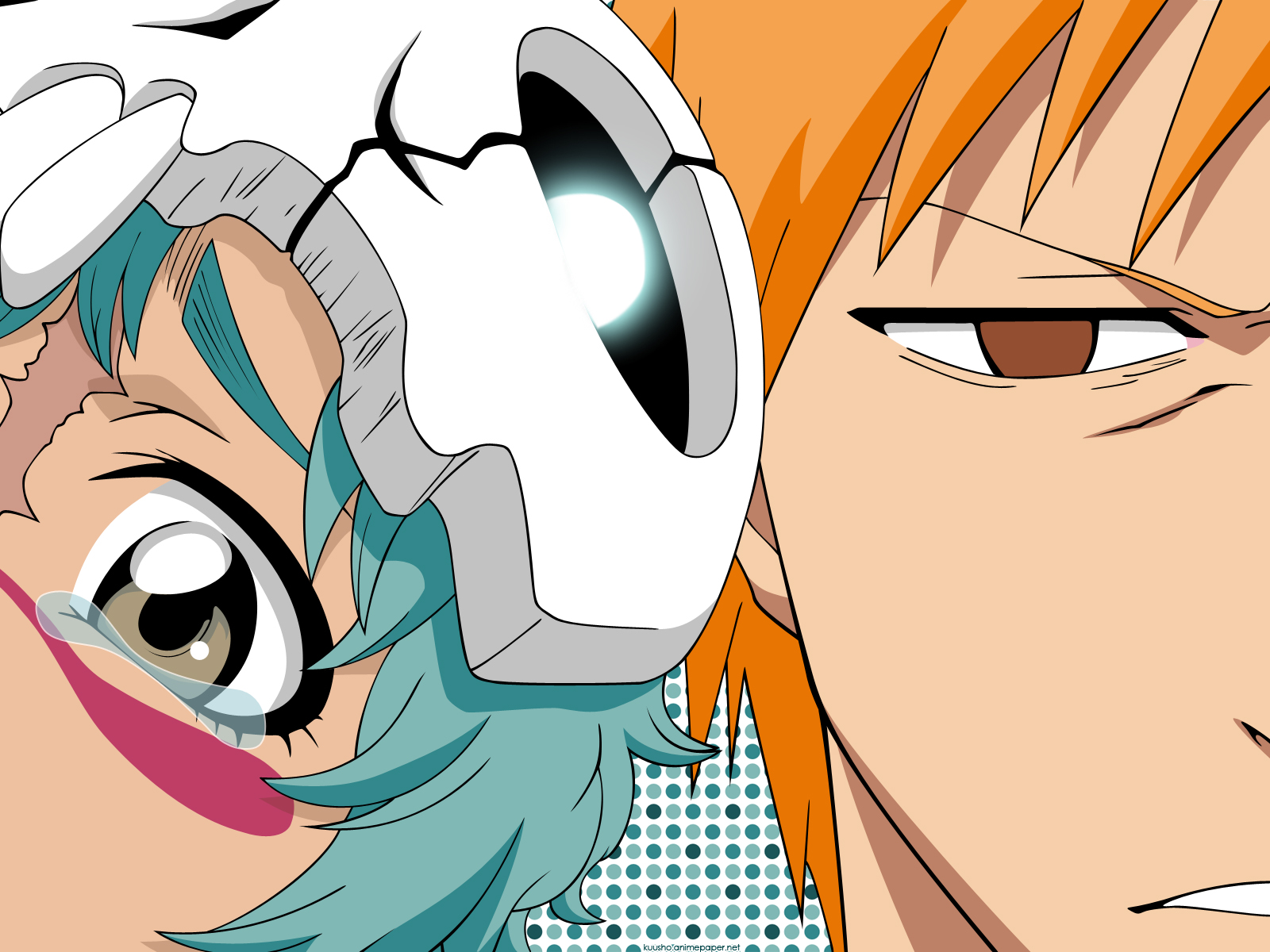 Description: A couple of anime characters with different colored hair and makeup looks at each other with a strange look on their face.