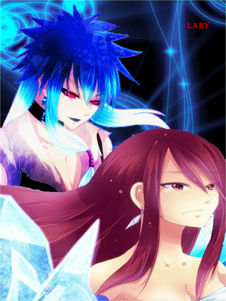 Description: A couple of anime characters in a dark room with ice crystals and a blue light behind them.