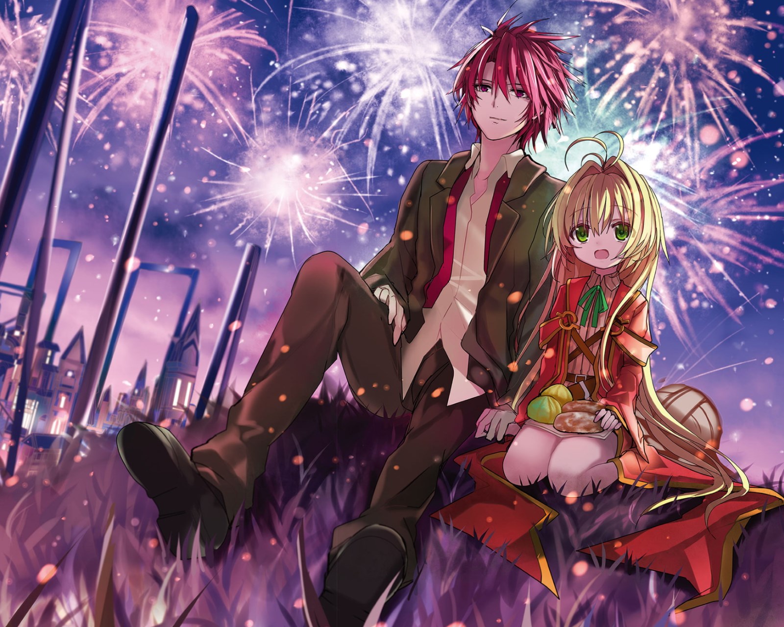 Description: A couple of anime characters sitting on a field of fireworks with fireworks in the background and a city skyline.