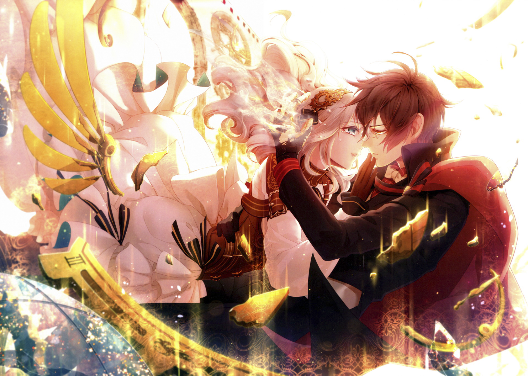 Description: A couple of anime characters standing next to each other in front of a background of flowers and plants and a gold chain.