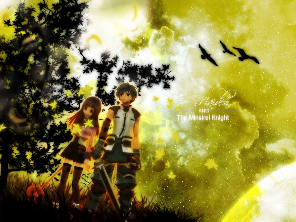 Description: A couple of anime characters standing next to each other in a field of grass and trees with a bird flying overhead.