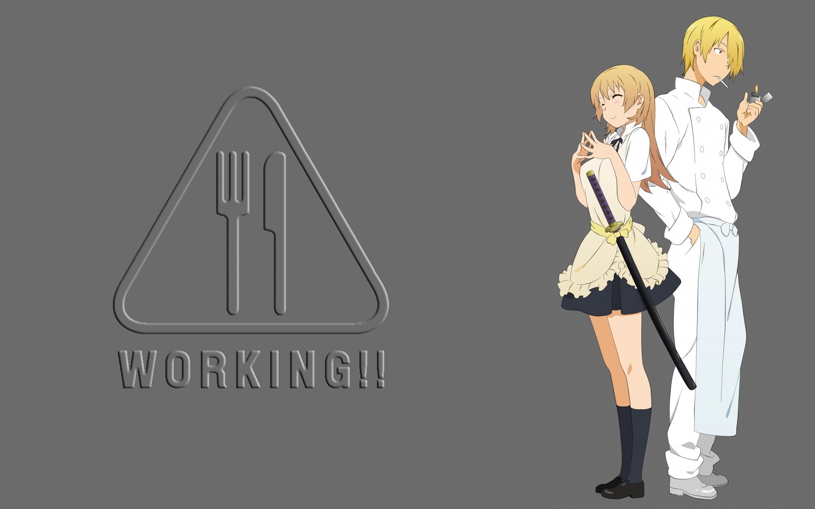 Description: A couple of anime characters standing next to each other with a fork and knife in their hand and a fork in their other hand.