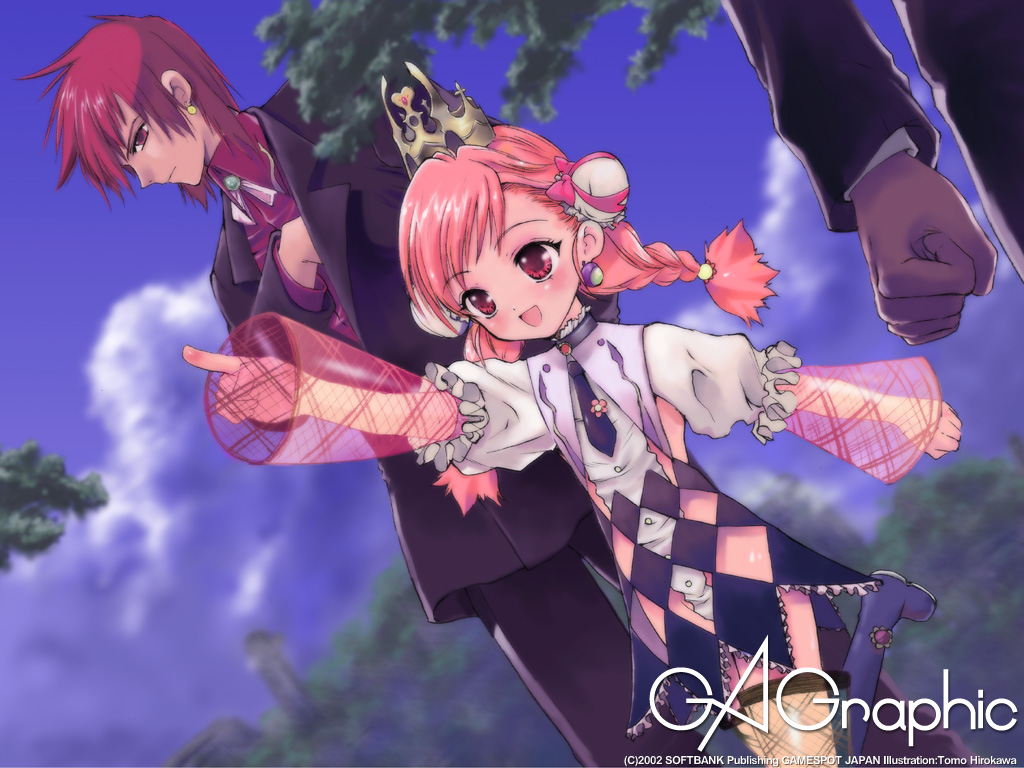 Description: A couple of anime characters standing next to each other in front of a tree and sky background with clouds.