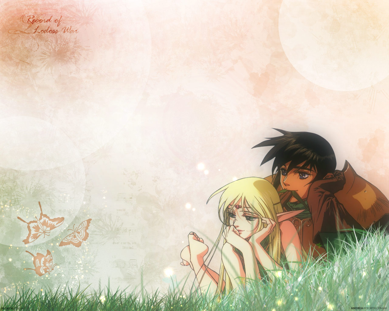 Description: A couple of anime characters sitting in the grass together with butterflies flying overhead in the background of the picture.