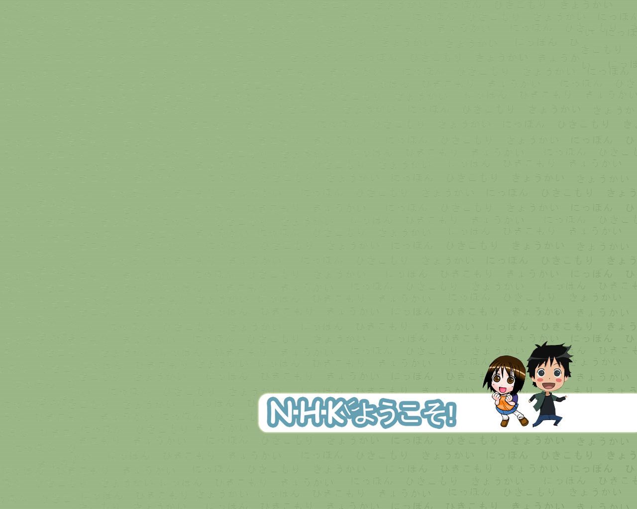 Description: A couple of anime characters on a green background with a name tag in the middle of the image and a cartoon character on the bottom of the image.