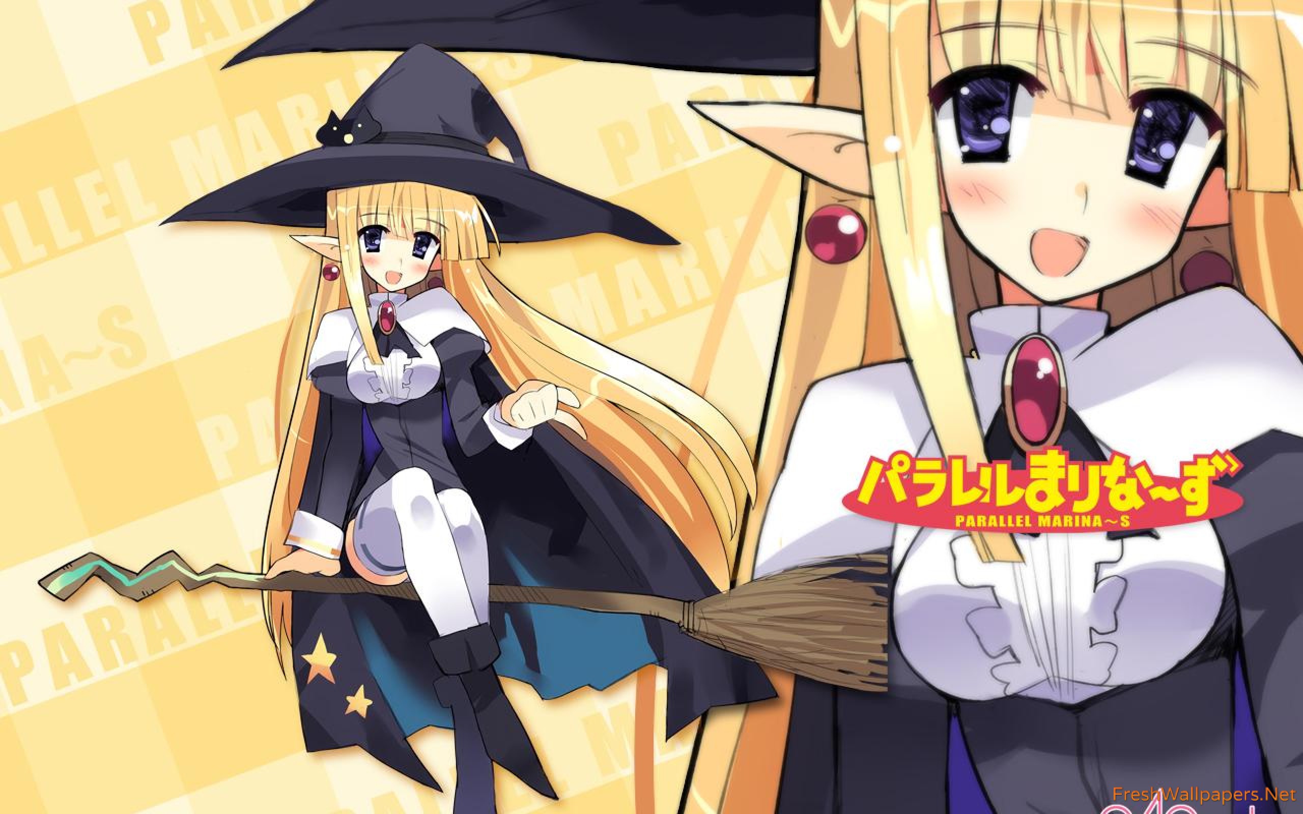 Description: A couple of anime characters with hats on their heads and a broom in their hands.