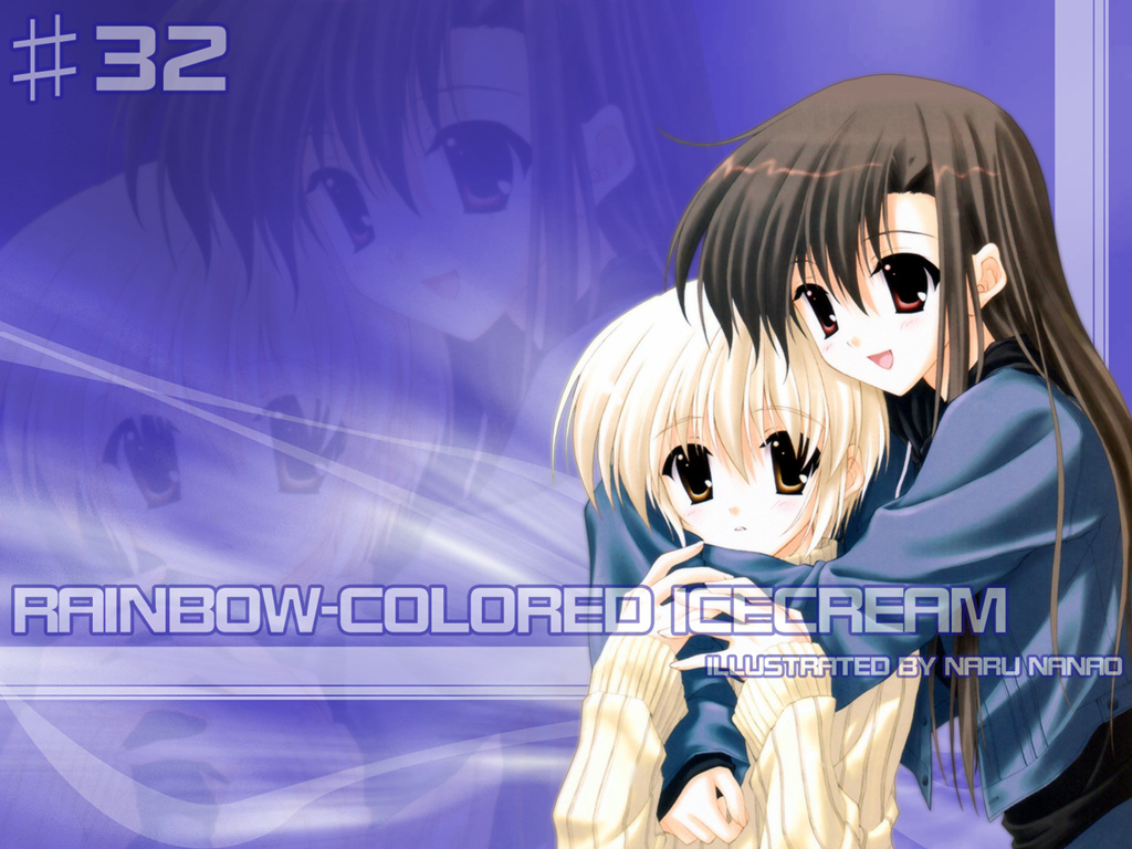 Description: A couple of anime characters hugging each other in front of a purple background with the words rainbow colored ice cream.