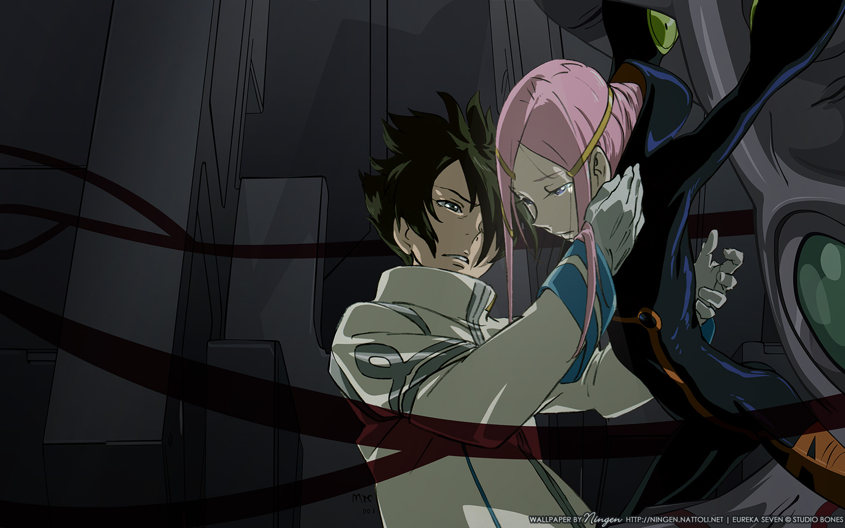 Description: A couple of anime characters hugging each other in a room with a wall in the background and a door in the foreground.