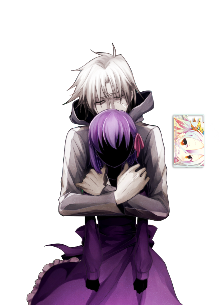 Description: A couple of anime characters hugging each other with a black background behind them and a card with a picture of a cat on it.