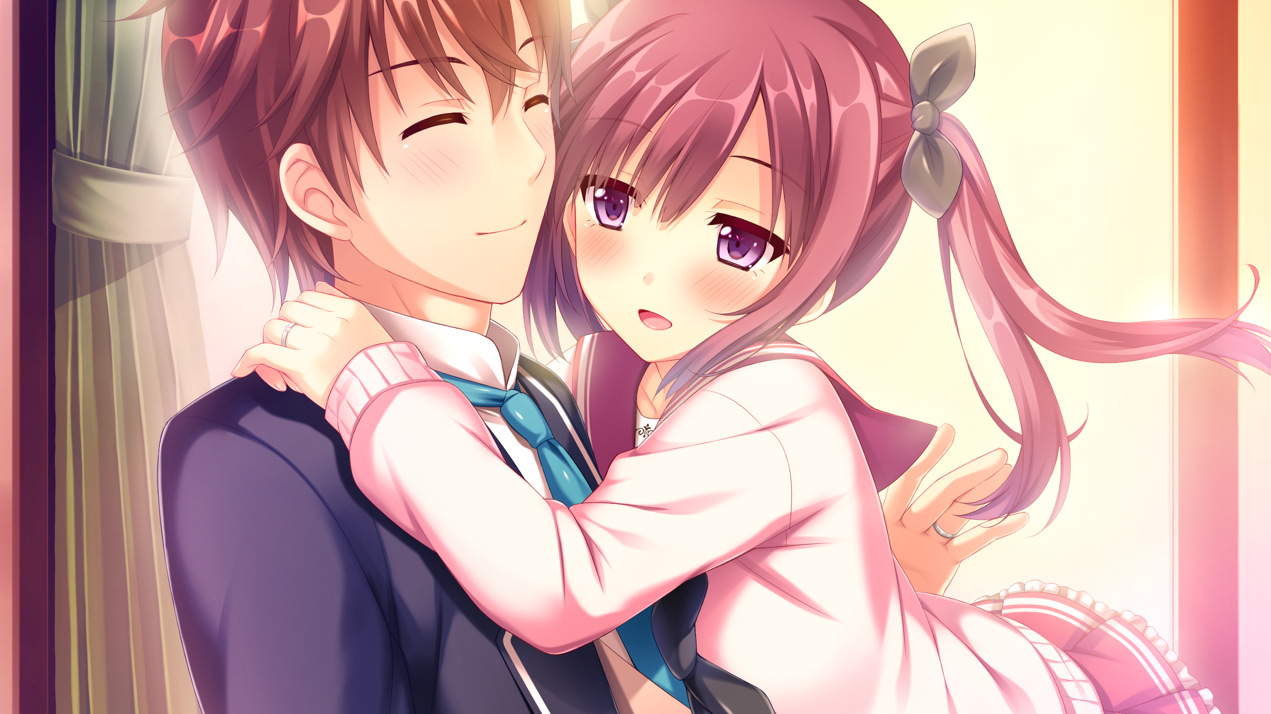 Description: A couple of anime characters hugging each other in a room with a window behind them and a pink background.