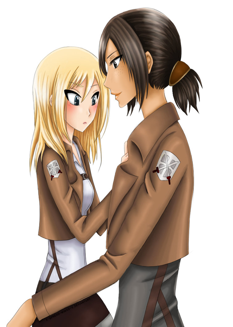 Description: A couple of anime characters are hugging each other with a smile on their faces and one is holding the other's hand.
