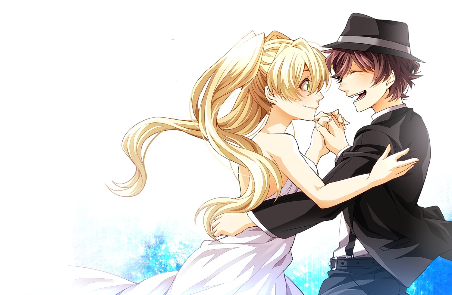 Description: A couple of anime characters kissing each other with a blue background behind them and a white background behind them.