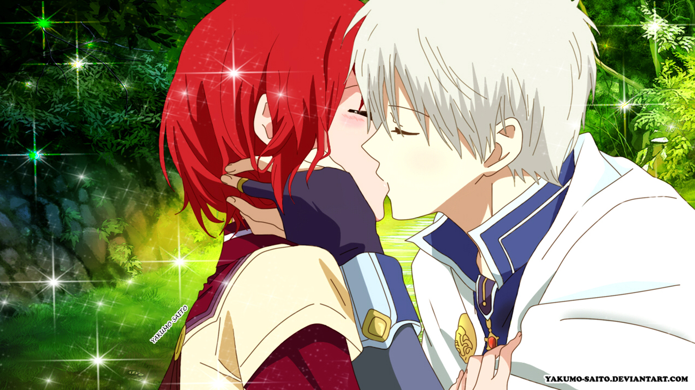 Description: A couple of anime characters kissing each other in front of a forest background with stars and sparkles in the sky.