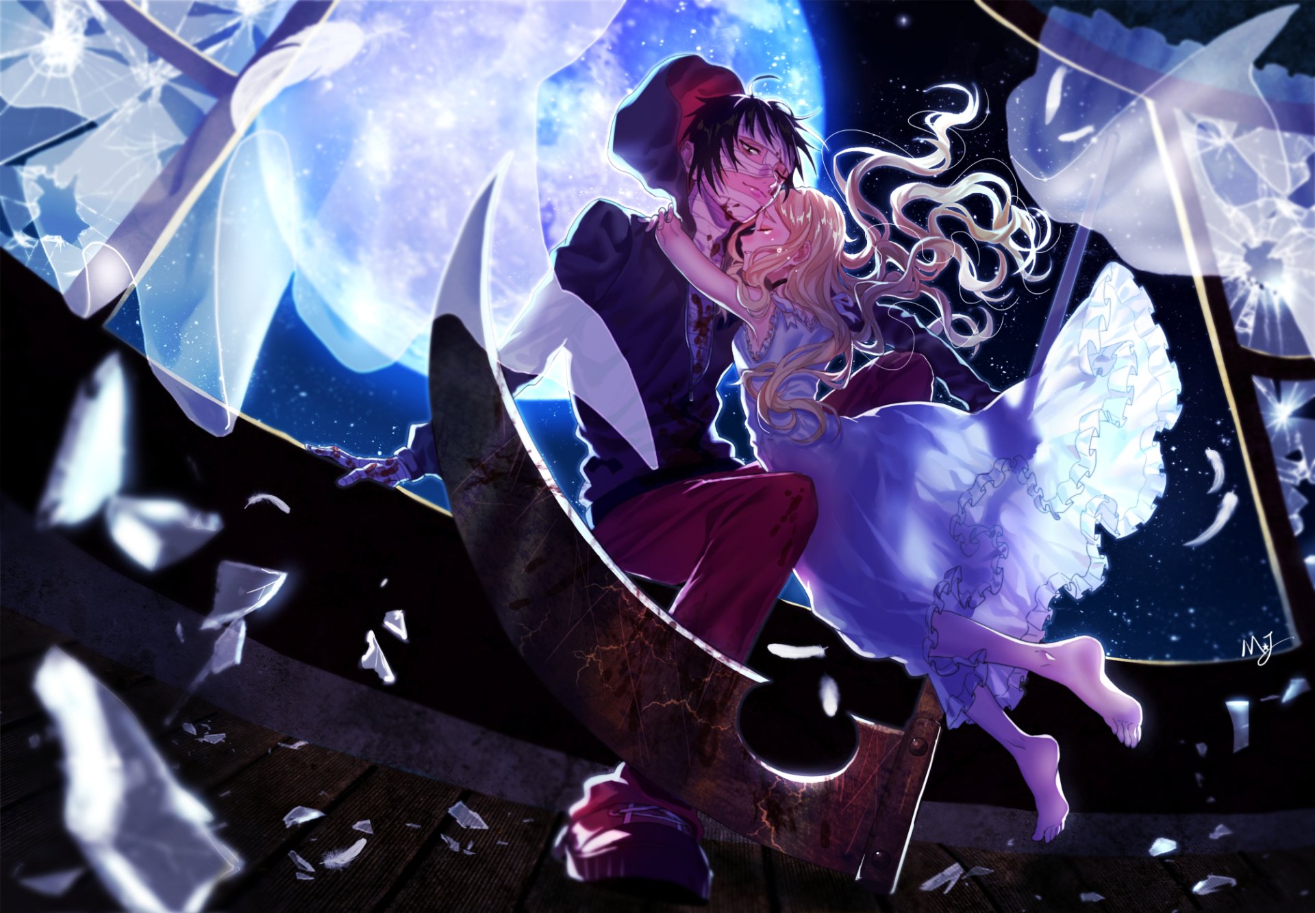 Description: A couple of anime characters are kissing in front of a full moon and stars background with a blue moon.