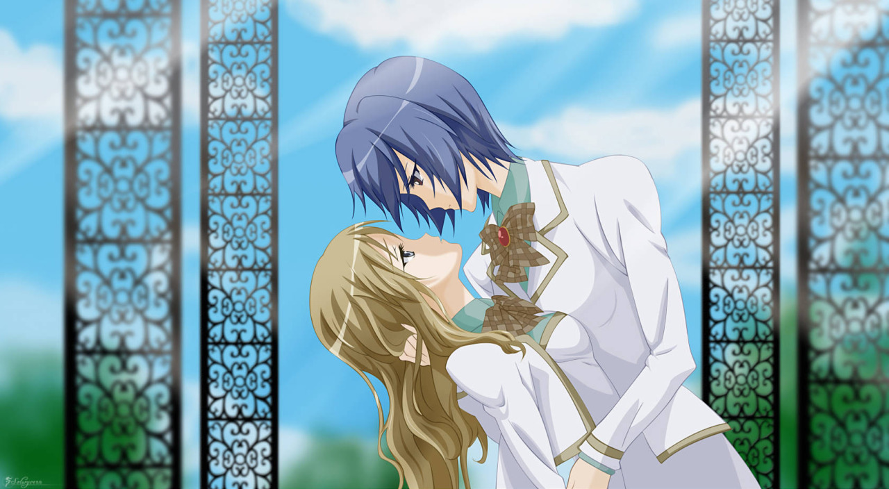 Description: A couple of anime characters kissing each other in front of a gate with a sky background and clouds in the background.
