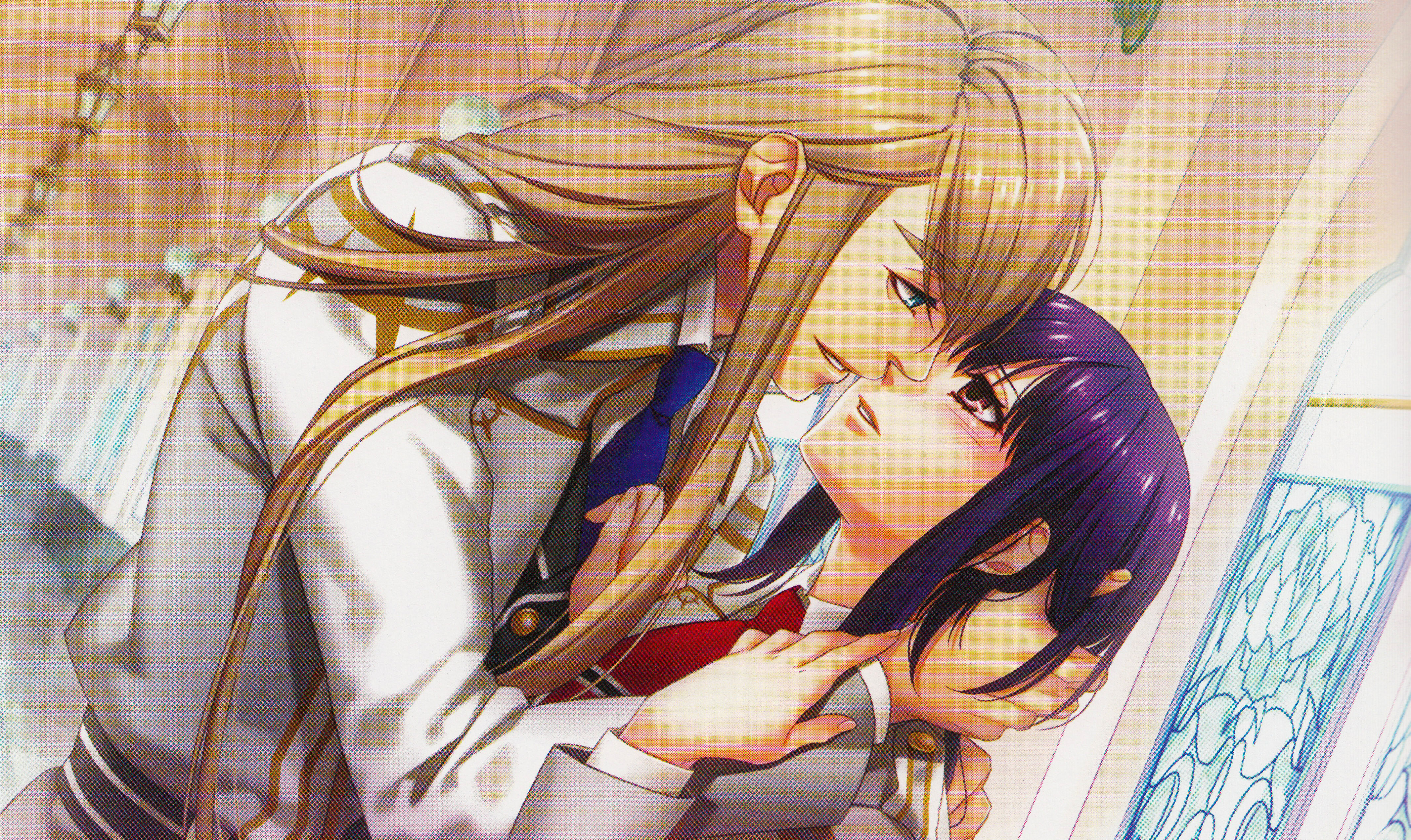 Description: A couple of anime characters kissing each other in a room with a window behind them and a wall with a clock on it.