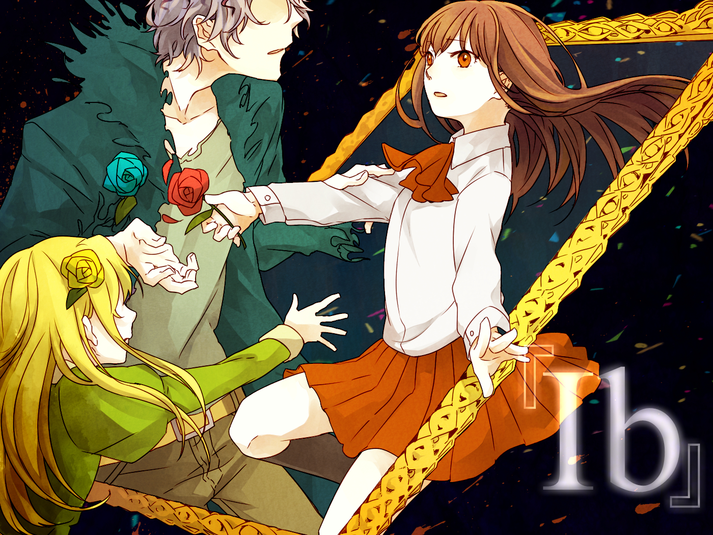 Description: A couple of anime characters standing next to each other in front of a mirror with a flower in it.