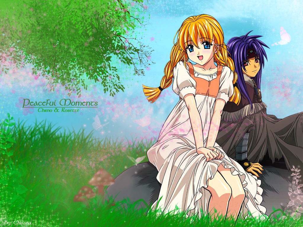 Description: A couple of anime characters sitting on a rock in the grass with trees in the background and a blue sky.