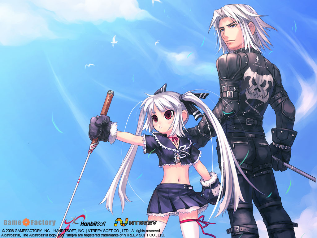 Description: A couple of anime characters standing next to each other on a blue sky background with clouds and a skull.