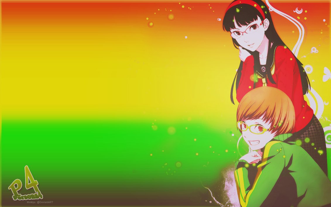 Description: A couple of anime characters standing next to each other on a colorful background with a green and yellow background.