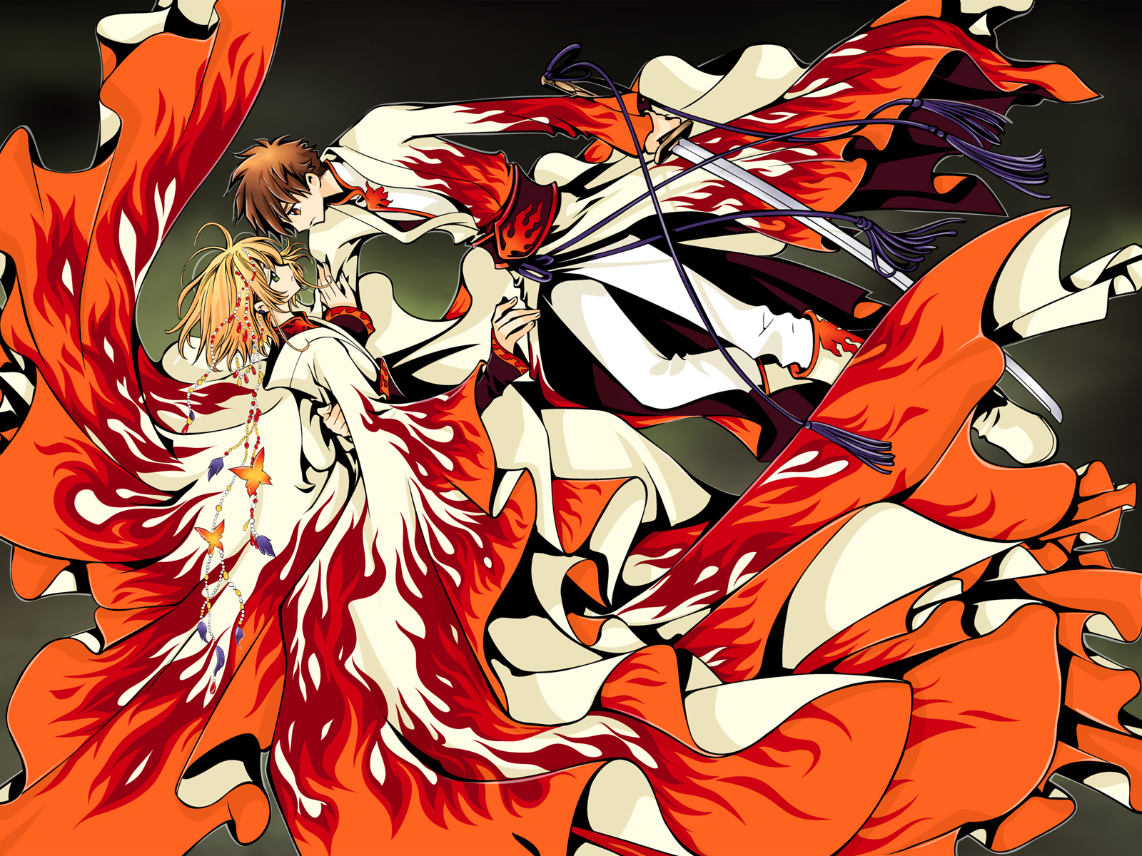 Description: A couple of anime characters are hugging each other with a sword in their hands and a red dress on.