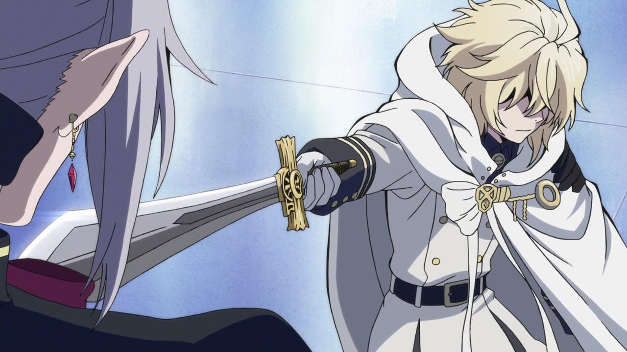 Description: A couple of anime characters holding swords in their hands and looking at each other with a smile on their face.