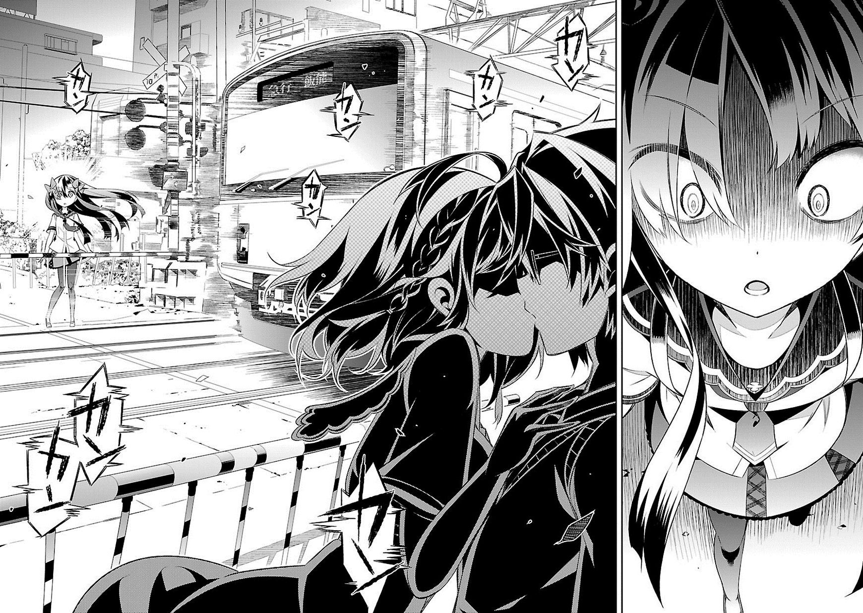 Description: A couple of anime characters standing next to each other in front of a train station with a train on the tracks.