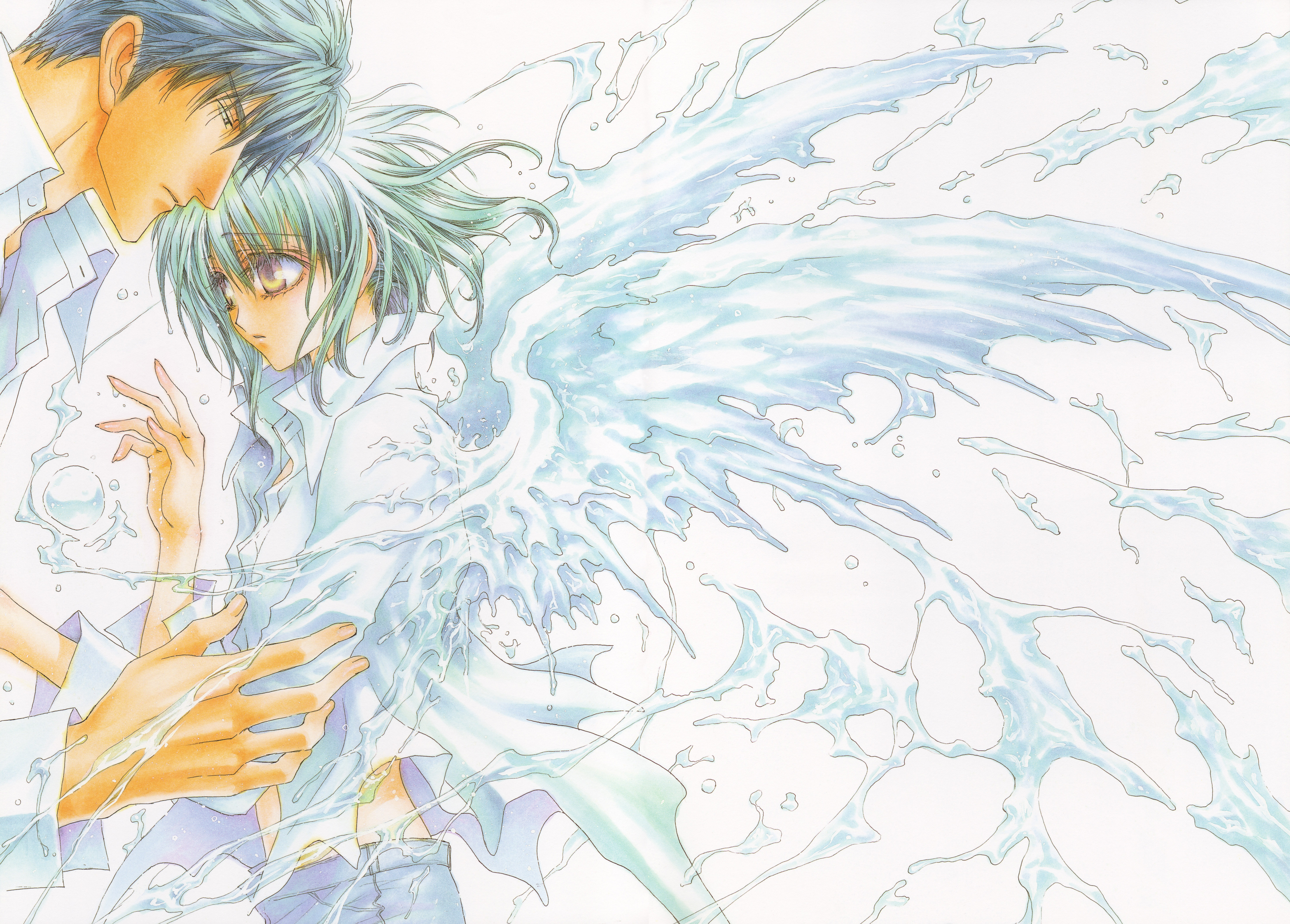 Description: A couple of anime characters with water splashing around them and one holding the other's arm and the other holding the other.