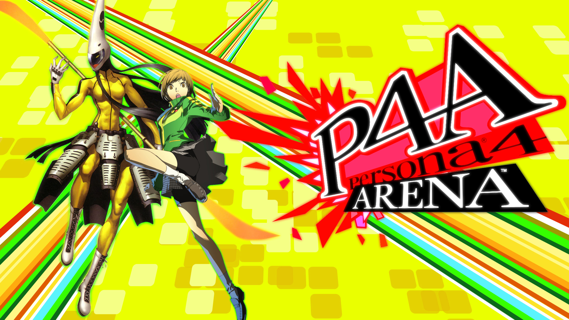 Description: A couple of anime characters are standing together in front of a yellow background with colorful lines and a black and white text.