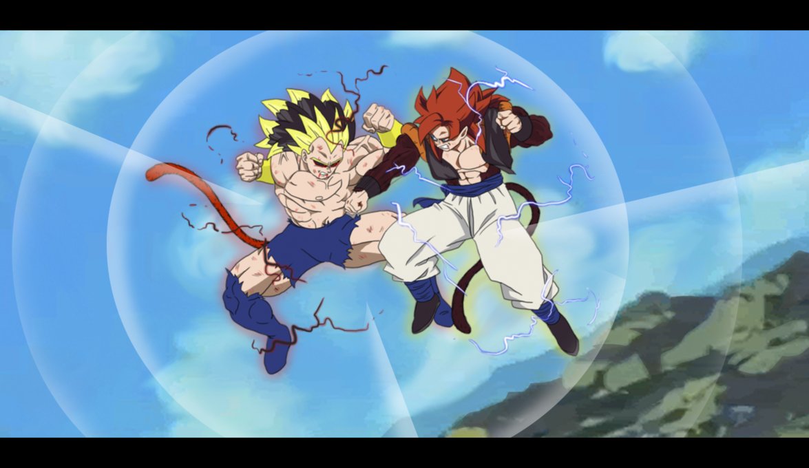 Description: Two anime characters are fighting in the air with each other in the background of a blue sky with clouds.