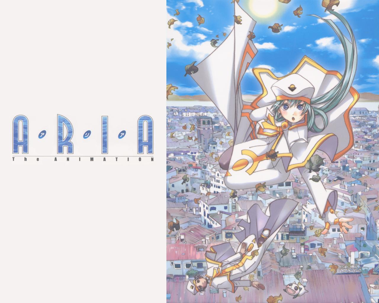 Description: A anime character flying through the air over a city with buildings and a kite in the air with a sky background.