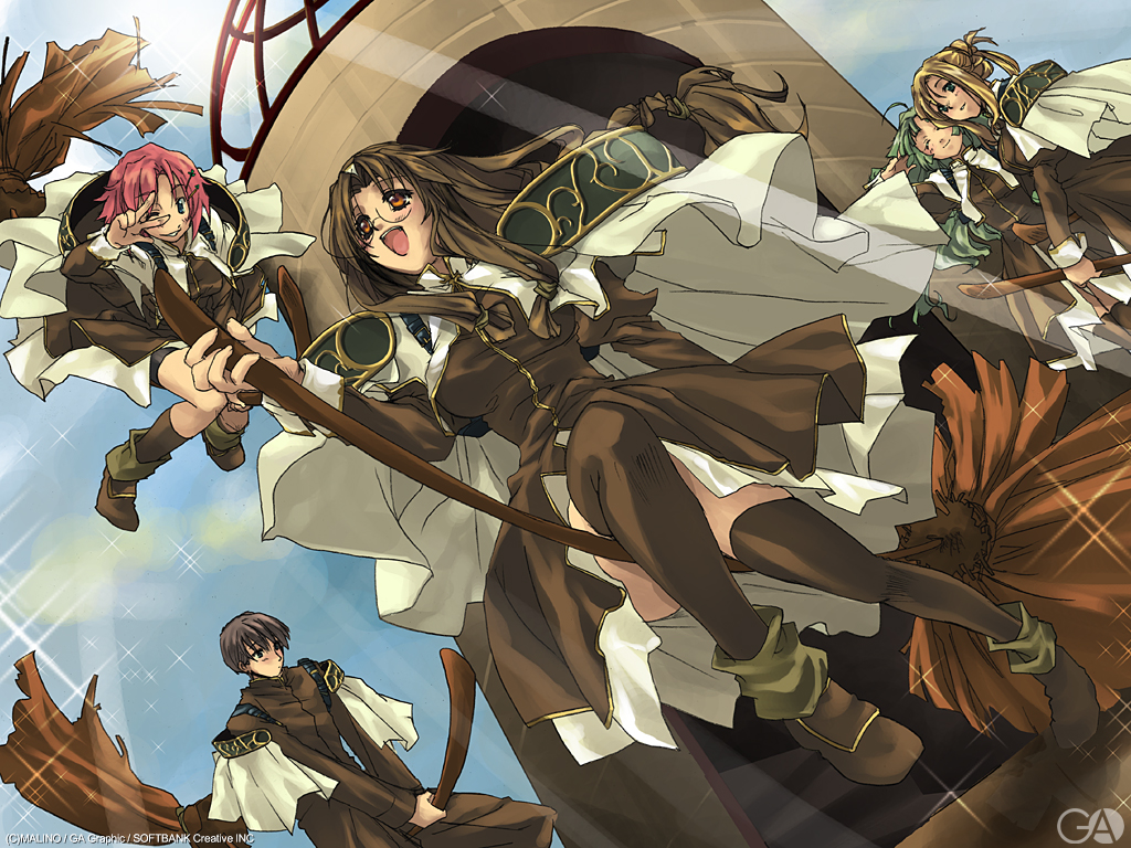 Description: A group of anime characters flying through the air with a sword and a bird on their shoulder.