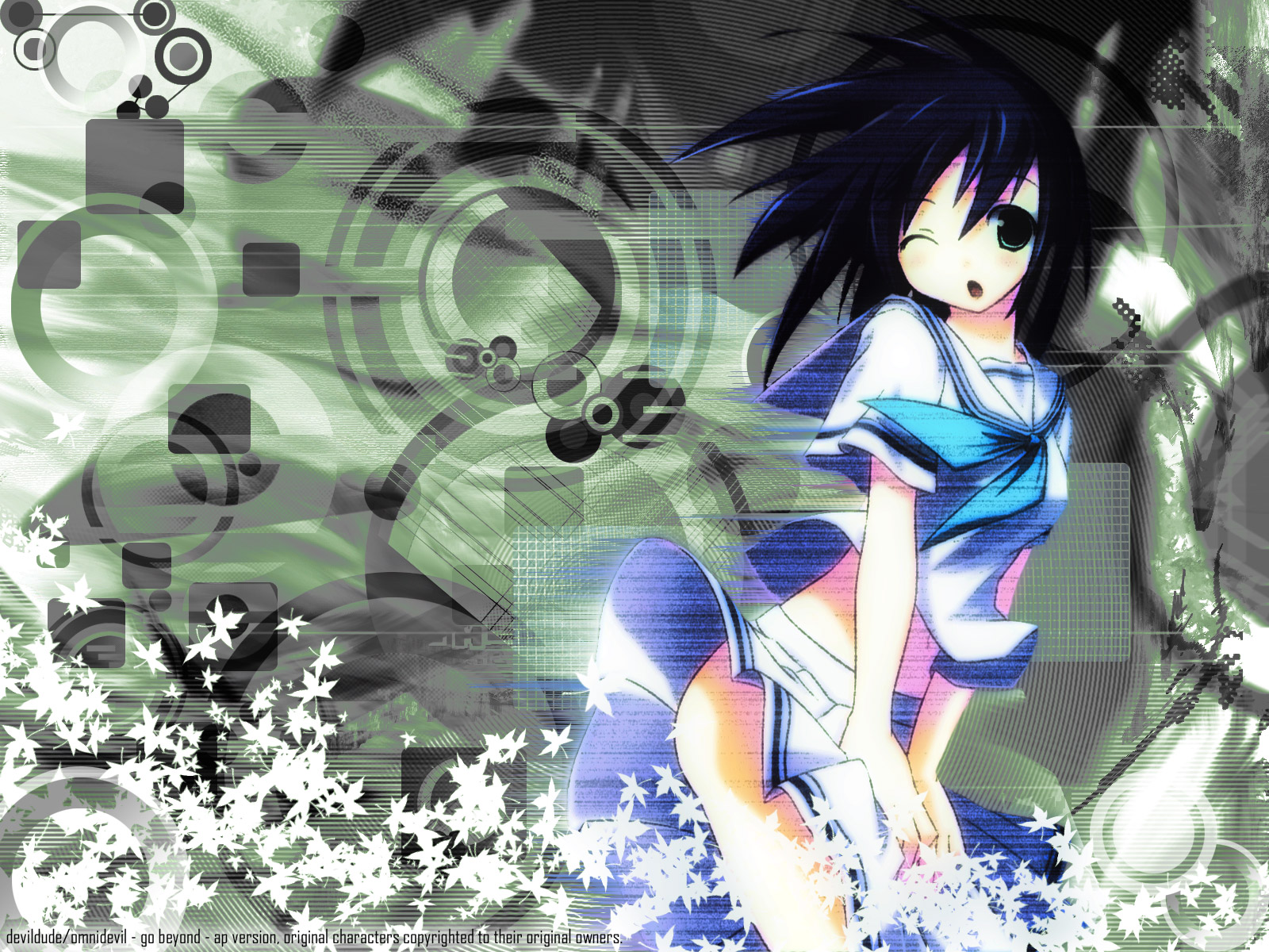 Description: A anime girl with black hair and blue eyes is standing in front of a green background with white flowers.