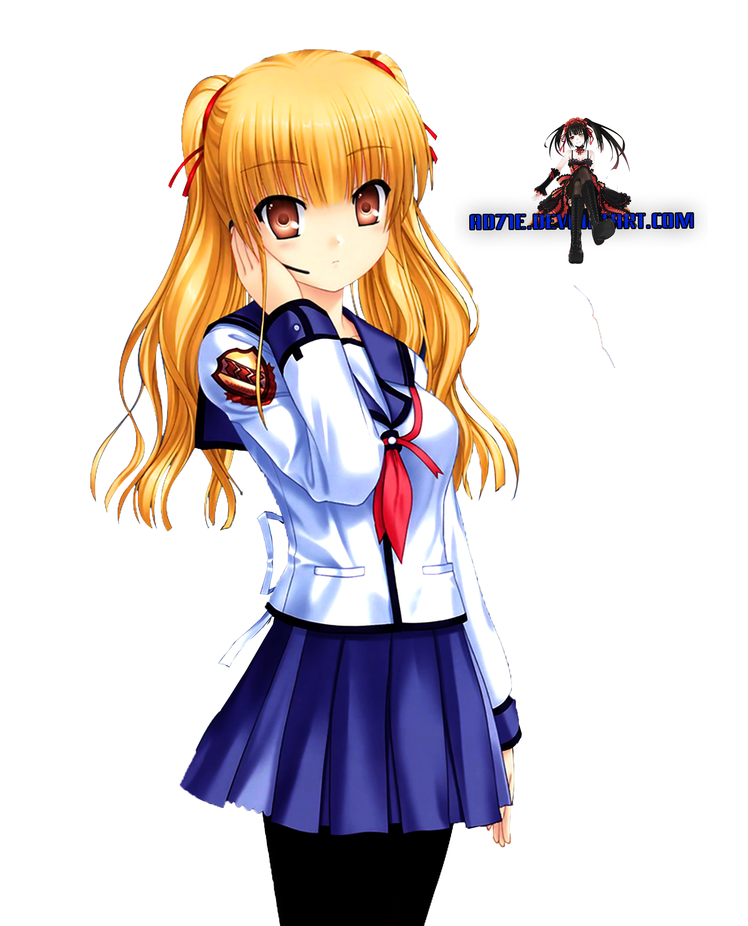 Description: A anime girl with long blonde hair and a blue dress is standing in front of a white background and has a black and red tie.